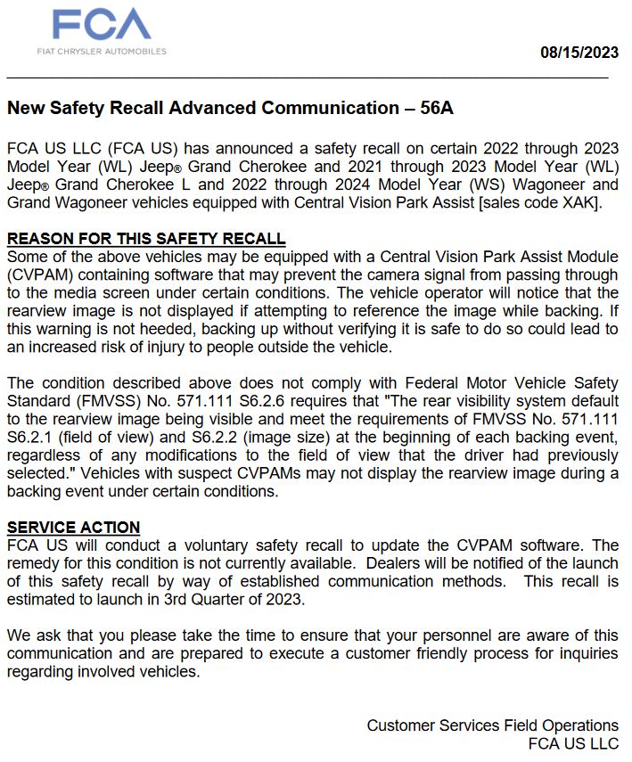 Recall 56A - Grand Cherokee MY21-23 Rearview Camera Visibility