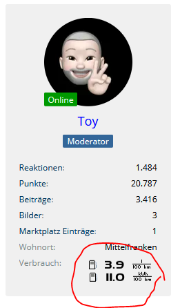Wenn du bei Spritmonitor angemeldet bist und deine Lade- und Tankvorgänge dort akribisch einträgst, bekommst du dort für jedes angelegte Fahrzeug eine ID-Nummer. Diese ID kann in deinem Profil vom 4xe-Forum hinterlegt werden, dann erscheint bei jedem deiner Beiträge dein aktueller Durchschnittsverbrauch.