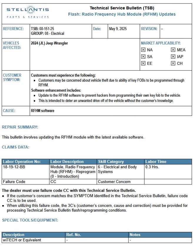 Die Informationen sind ziemlich spärlich, aber so wie es sich darstellt kann über das RFHM das Auto manipuliert und geklaut werden. Das TSB beschreibt ein Update für den RF-Hub, um die Lücke zu schließen.