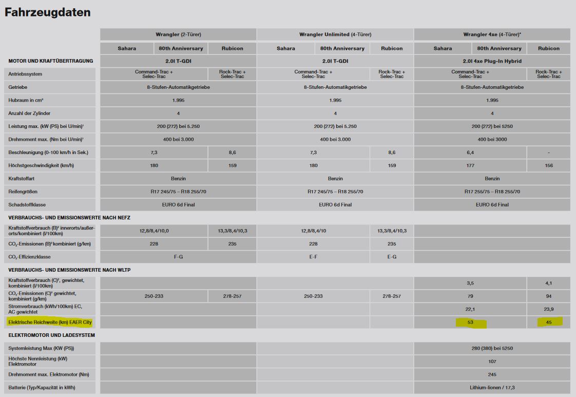 Kaum hat man mit WLTP versucht, den Verbrauch realitätsnäher darzustellen, kursiert die nächste Welle der Roßtäuschung. Die Hersteller weisen in ihren Preislisten bei der elektrischen Reichweite den Wert nicht mehr nach WLTP RDE aus, sondern mit dem geschönten Wert nach WLTP AER City. Also eine Reichweite ausschließlich innerorts mit niedrigen Geschwindigkeiten. So kommts, dass nun auch der Wrangler plötzlich eine elektrische Reichweite von über 50km im Prospekt stehen hat. Technisch verändert wurde an den Autos gar nichts, hier wird nur mit geschönten Werten getrickst.