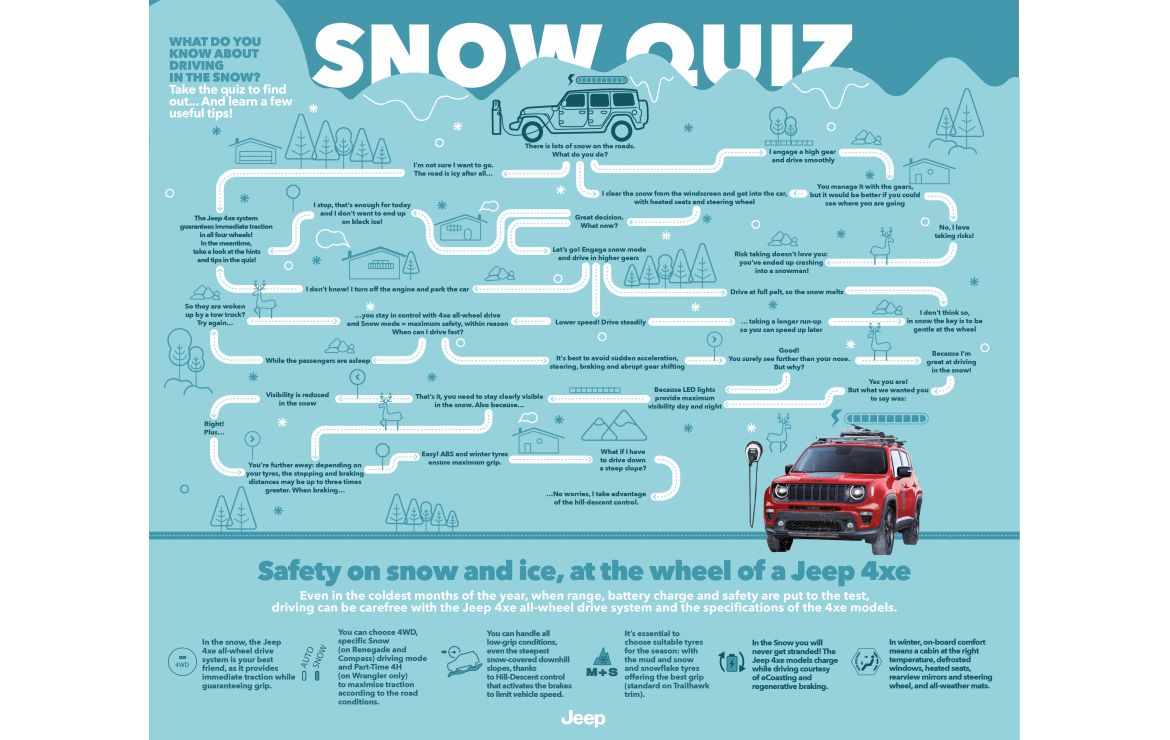 The Jeep® brand has developed a fun quiz to find out how much you know about driving in winter and to highlight the capabilities of the Jeep Renegade, Compass and Wrangler SUVs with the new 4xe Plug-In Hybrid all-wheel drive system. All this plus a few useful hints and tips from the Jeep brand for taking on the challenges of winter safely and with peace of mind.
