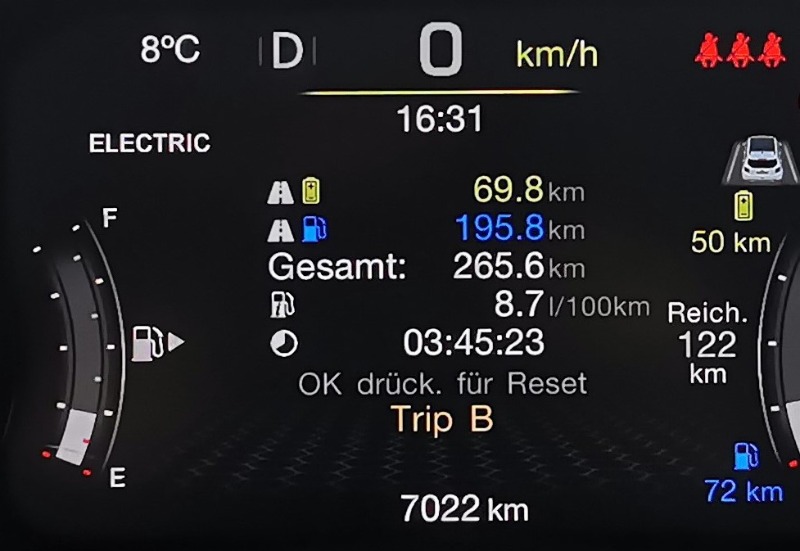 Vielleicht wage ich auf der nächsten Langstrecke mit voller Batterie den Tank leer zu fahren.