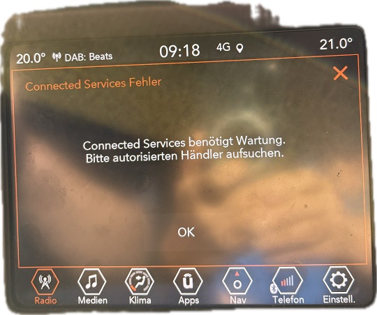 Meinen Compass zum Radio-Tausch abgegeben und einen MY20 Mexico Compass mitgenommen. Kaum das Teil angelasses, kam schon die Meldung: "Connected Services benötigt Wartung. Autorisierten Händler aufsuchen".