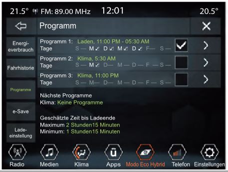 Einfach den Button "Programme" betätigen, auf der folgenden Seite können Programme zum Klimatisieren und Laden erstellt werden. Es werden jeweils 3 Programme angeboten, die mit einer Klima- oder Ladefunktion belegt werden können. Früher konnte man noch weitere Programme anlegen, das gibt es aberanscheinend nicht mehr.