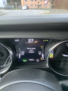 nach einem Software Update im Autohaus, lässt sich der Eletric modus nicht mehr manuell einschalten. Zuvor war dies nicht der Fall. Der Wagen ist gerade mal ca. 5.000 Km gelaufen. Das Autohaus kann sich den Fehler nicht erklären und sucht noch immer nach dem Problem.