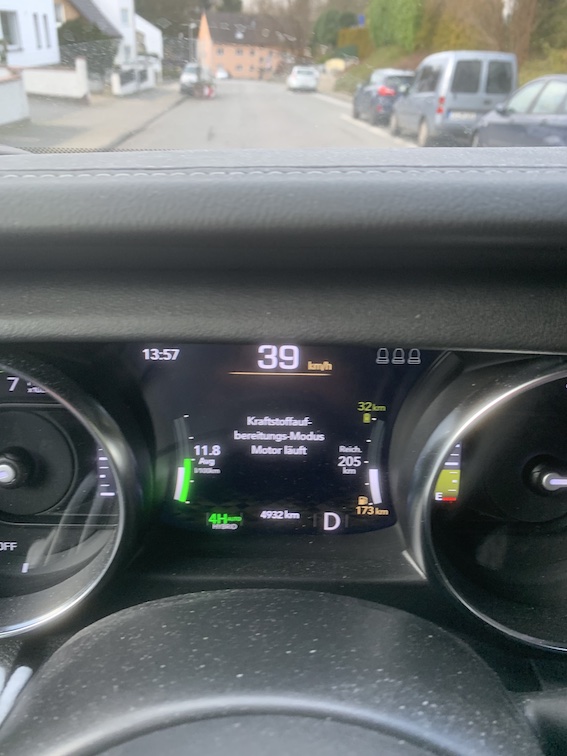 Anzeige auf dem Display: "Kraftstoffaufbereitungs-Modus Motor läuft". Sobald sich der Kraftstoffaufbereitungsmodus einschaltet, lässt sich der Electric Modus nicht mehr manuell einschalten und der Wagen läuft nur noch im Verbrennungsmotor Modus.