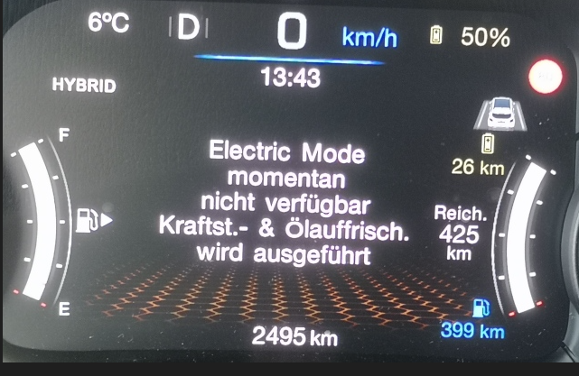 habe das update ebenfalls heute erstmals die Meldung das e-Modus nicht verfügbar und die Kraftstoff Ölauffrischung ausgeführt wird. OMG hab den Tank voll gemacht bin ne Stunde rumgefshren, aber nix da.