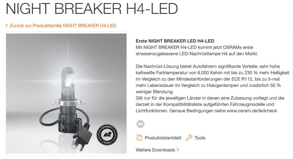 Hab grad mal nachgeschaut, die OSRAM NIGHT BREAKER H4-LED kosten im Netz zwischen 133,- und 166,- Euro, also durchaus ein guter Preis für bis zu 230% mehr Helligkeit!