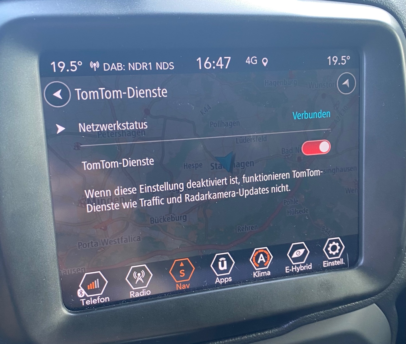 Beim Starten des Autos scheint das Uconnect nur einen einzigen Versuch zu unternehmen, eine Verbindung zu TomTom aufzubauen. Scheitert dieser Versuch aus irgendeinem Grund, weil z. B. die TBM noch nicht fertig eingebucht ist, schmollt das System für den Rest der Fahrt. Ich habe dann mal mehr zufällig herausgefunden, dass dieser „Schalter“ einen neuen Verbindungsaufbau anstößt.