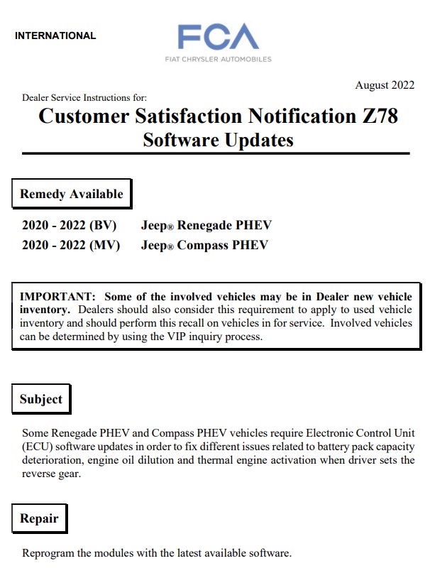 Recall Z78 - Renegade / Compass MY 20-22 PHEV Software Updates