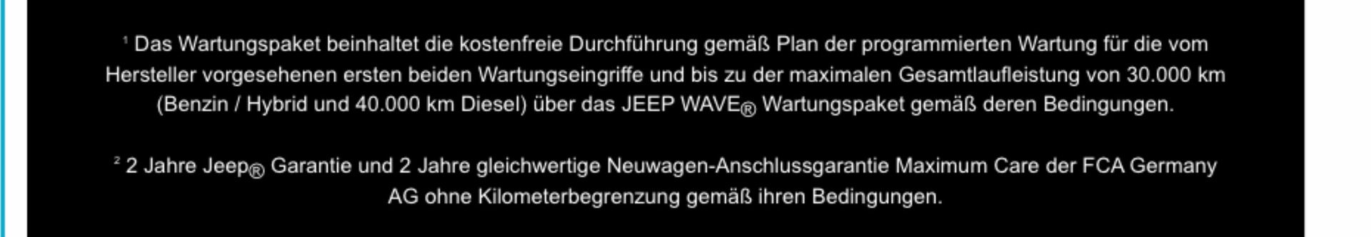 Mein Händler in Berlin meinte auch zu mir, dass er nichts in Richtung Jeep Wave/Garantieverlängerung anbieten könne. Habe mich bei einem anderen Händler in Potsdam informiert und dort nun nach langem Überlagen und Rechnen Jeep Top Care für vier Jahre/80T km abgeschlossen. Anscheinend kann nicht jeder alles anbieten.