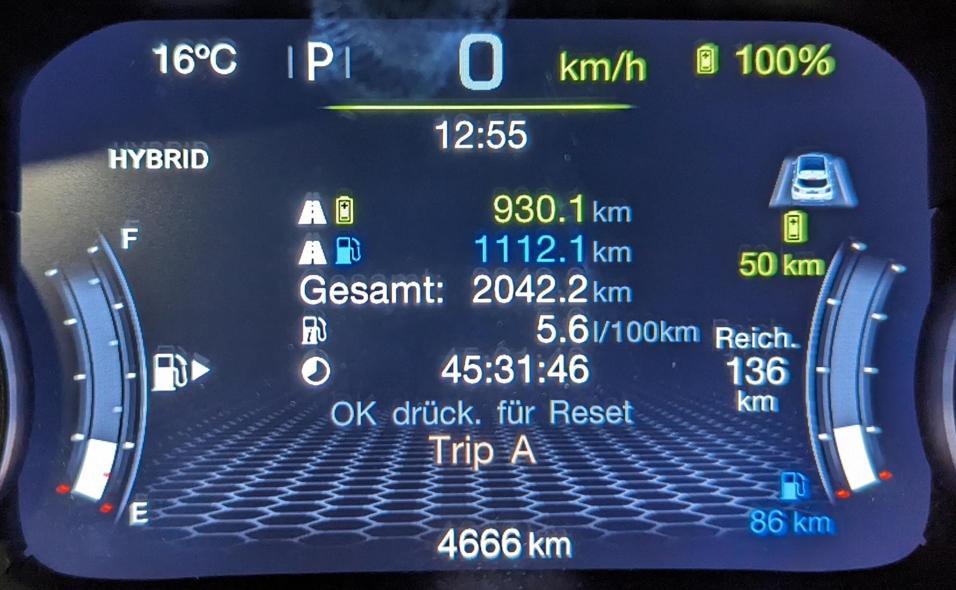 War gestern knapp 650 Kilometer unterwegs. Fuhr im Hybrid Modus mit einem Verbrauch um die 6,7 ltr. Die komplette Fahrzeit betrug 7 Stunden. Relativ staufrei durchgekommen. Bin sehr zufrieden mit meinem Trailhawk.