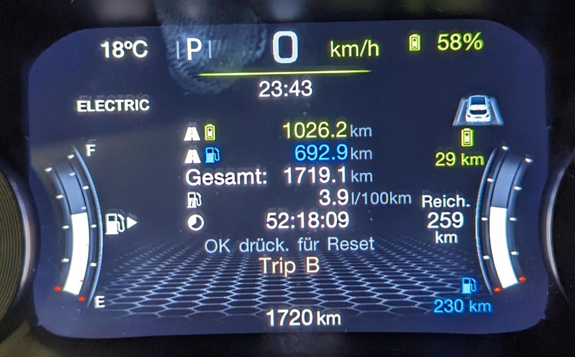 Der el. Anteil durch Rekuperation hat bei Hybriden einen ganz gewichtigen Einfluss auf den Benzinverbrauch. Je nach Hybrid-System ergibt das eine durchschnittliche Verbrauchs-Reduzierung von 10-40%. Mit unserem C-HR Vollhybriden schaffe ich bei passender Fahrstrecke auch mal 50%, ohne auch nur 1 Gramm Strom von extern zu laden. In dem Fall fällt der Benzinverbrauch auf 3,8L/100km. Beim System von Jeep ist die Rekuperation zwar systembedingt um einiges geringer, aber trotzdem vorhanden.