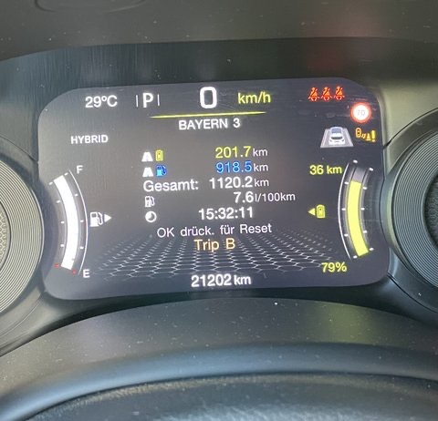 Hallo Zusammen, nachdem ich in diesem Jahr erstmals eine größere Strecke mit dem Renegade 4XE gefahren bin, muss ich sagen, dass mich das echt begeistert hat. Mit vollem Tank und vollem Akku los gefahren, waren es bei der Rückkunft aus Kaltern 1120 KM und, obwohl der Akku nicht nachgeladen und 201KM elektrisch zurück gelegt wurden, hat er noch immer 79%. Der Bordcomputer zeigt einen Verbrauch von 7,6 Ltr. an. Getankt habe ich 84,64 Ltr. und somit stimmt der Verbrauch exakt. Das hätte ich ehrlich gesagt nicht erwartet, habe es allerdings noch nie nachgerechnet, weil ich Kurzstrecken oft elektrisch fahre.
